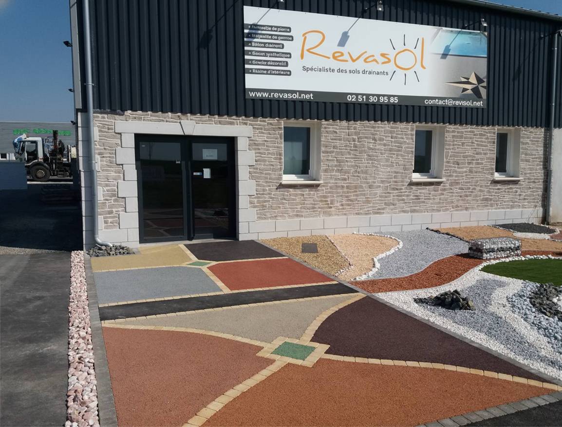 Réalisations de revêtements de sols extérieurs, béton désactivé, béton drainant, moquette de pierre, résine partout en Vendée, Nantes et La Rochelle