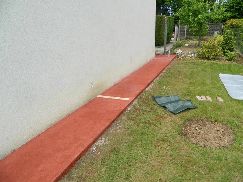 Réalisation d'un parking et des allées piétonnes en béton drainant coloré à la Roche sur Yon en remplacement des pavés auto bloquants. Décors losange et joints de dilatation en pavés ocre jaune. Le béton perméable de couleur saumon assure un esthétique et des avantages pour valoriser votre patrimoine.