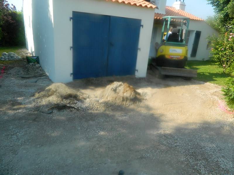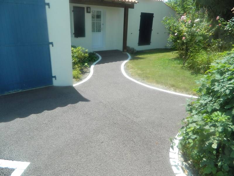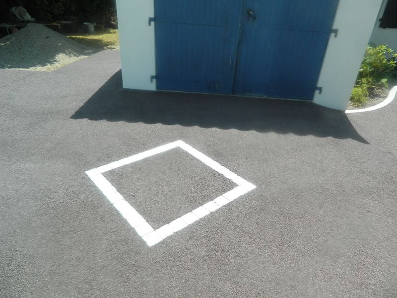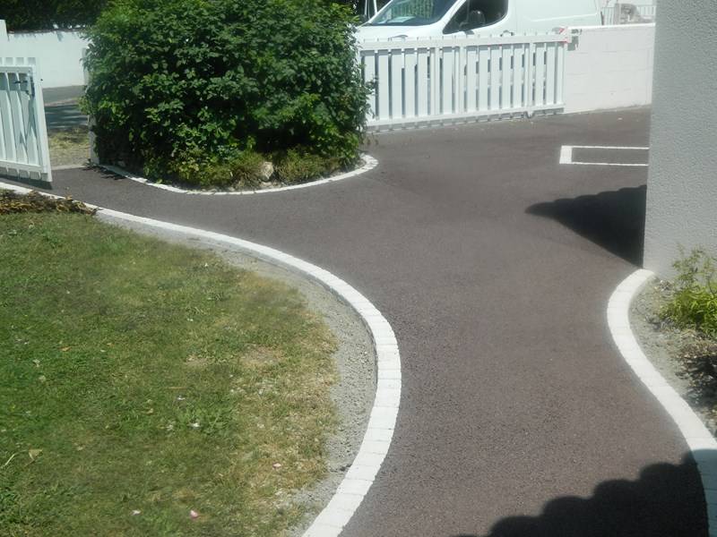 Aménagement de vos allées de voiture et piétonnes en béton drainant coloré REVASOL ton "terre de sienne" c'est l'assurance d'une décoration originale et esthétique. Les joints de dilatations sont discrets, un losange et une chaînette de pavés blanc pour délimiter vos massifs et votre pelouse augmentent et valorisent l'ensemble.