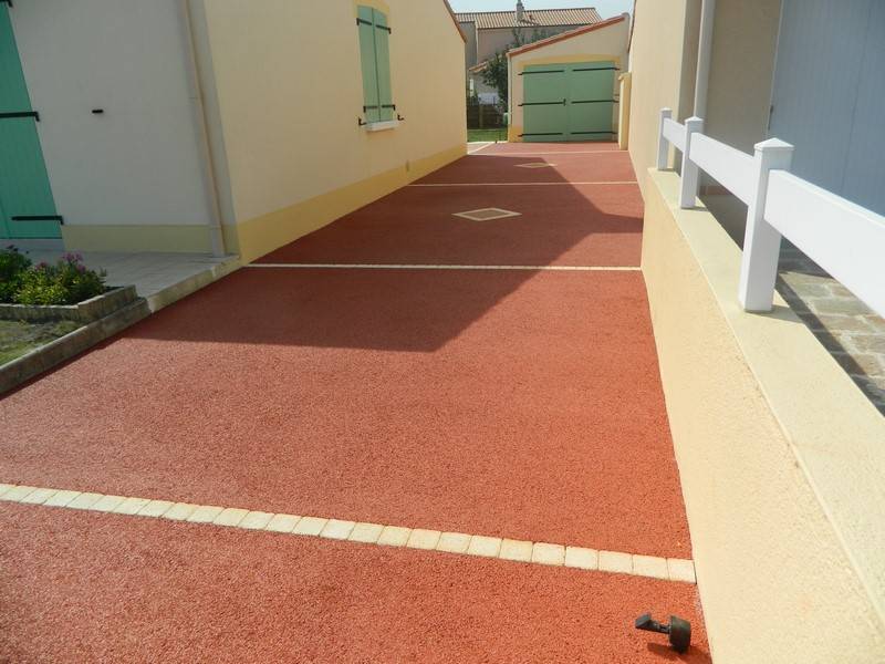 Réalisation d'une allée de garage en béton poreux coloré dans la masse, avec des joints de dilatation en pavés et 2 losanges pour plus d'esthétique. Le béton drainant coloré REVASOL existe en 9 couleurs différentes pour satisfaire tout les besoins esthétiques, contemporain, provençale, sobre....