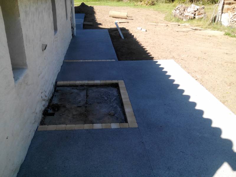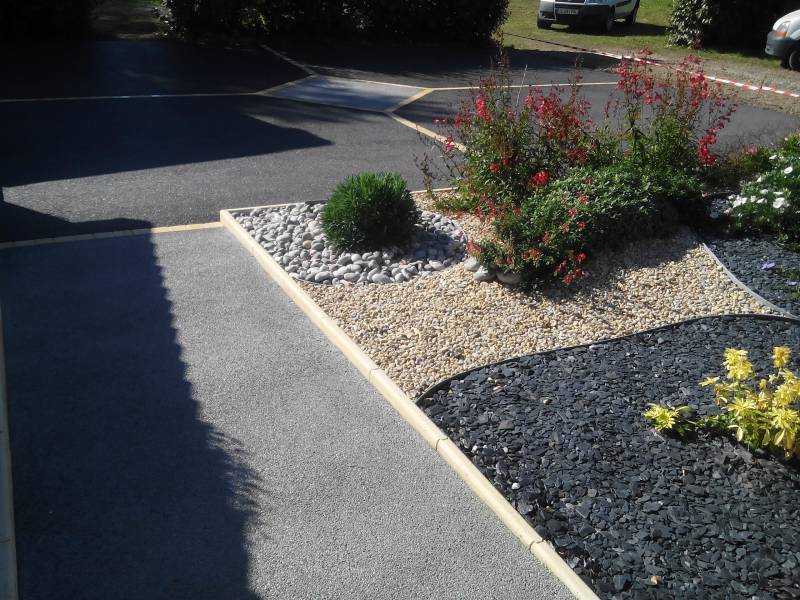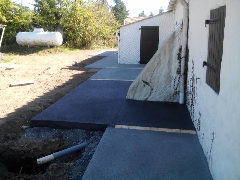 Réalisation des contours et allées piétonnes de maison en béton drainant coloré sans flaques d'eau.
