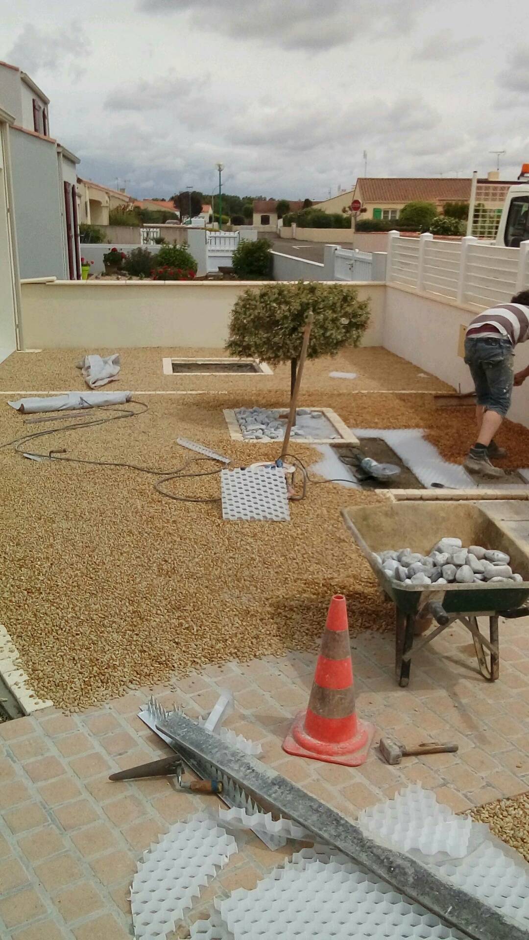 REVASOL réalise aussi vos aménagements extérieurs en minéraux décoratifs. Après terrassement et empierrement, nous avons délimité les massifs par la pose des pavés, tendu une toile de paillage et installer les galets. Le reste des surfaces ont été réalisé en alvéoles minéralisées en graviers quartz naturel.