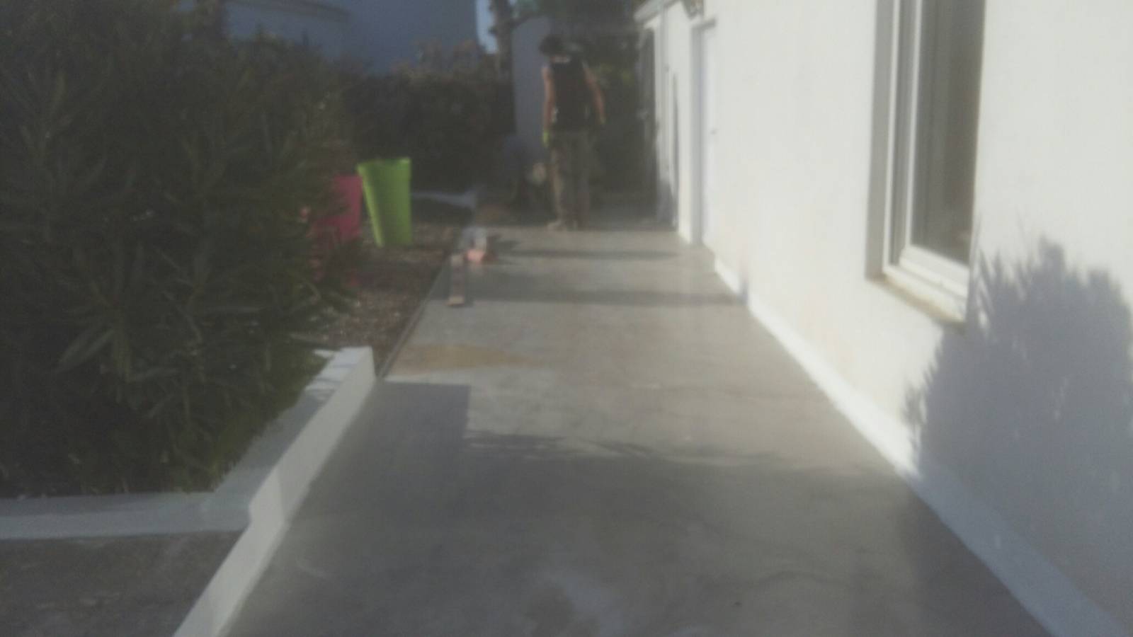 Réalisation après préparation du béton existant, chape, ragréage et primaire, du revêtement mince "moquette de pierre" en 2 coloris différents.