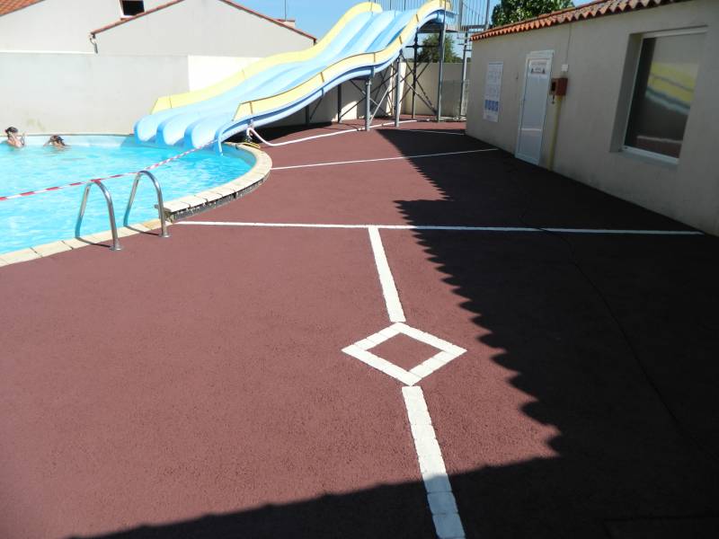 Remplacement d'un dallage par un revêtement drainant coloré pour la joie des utilisateurs : antidérapant, revêtement tempéré et décoratif.
