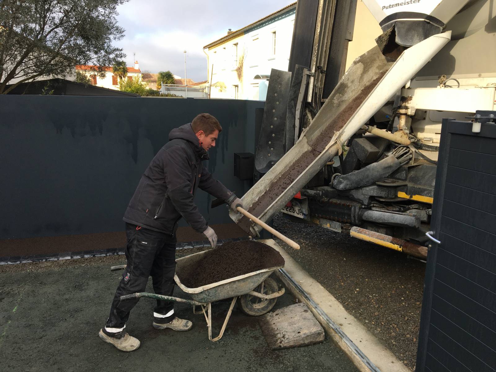 béton drainant gris anthracite. Cette réalisation distinctive allie élégance et fonctionnalité, créant un espace avant-gardiste. Le choix du