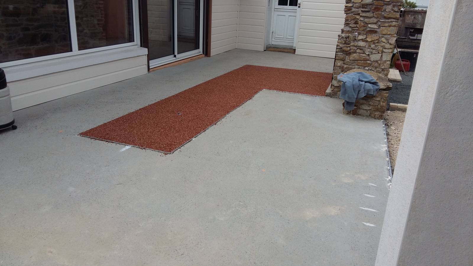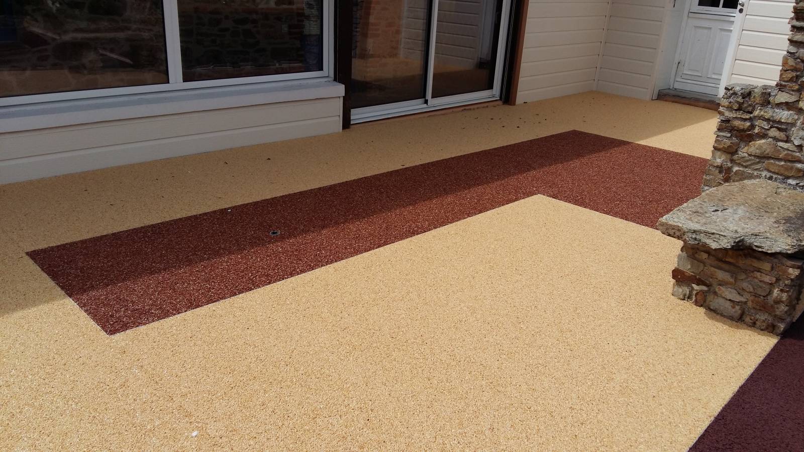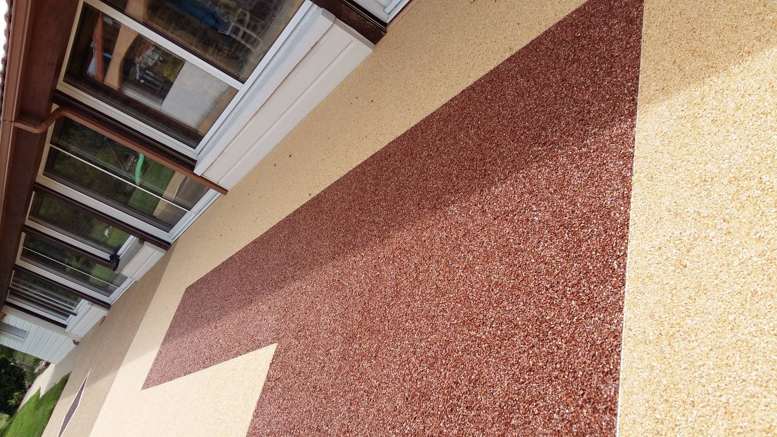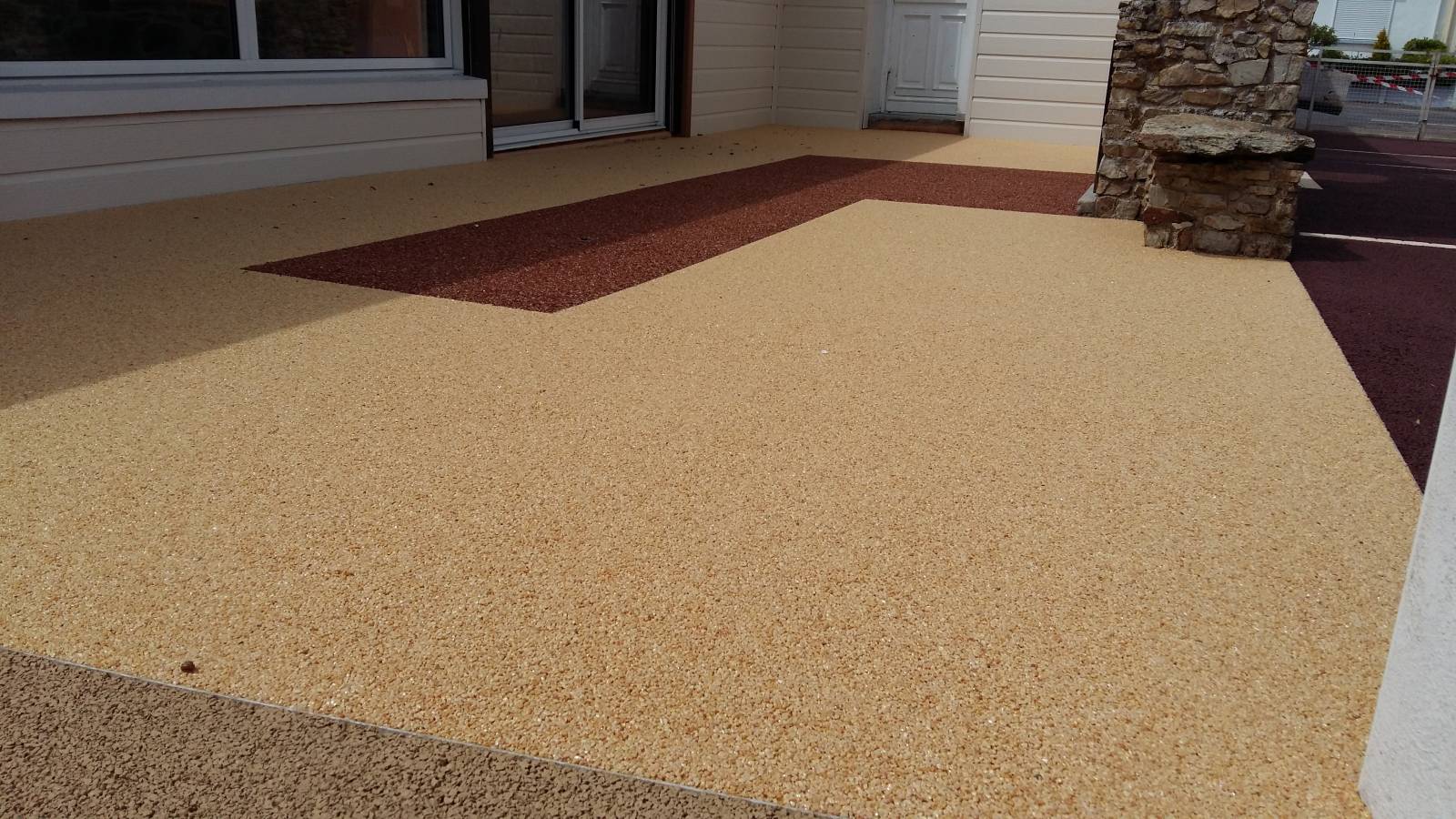 Réalisation d'une terrasse en moquette de pierre résinée de couleur rose valence et incorporation d'un motif rouge corail pour mettre en valeur cette terrasse.