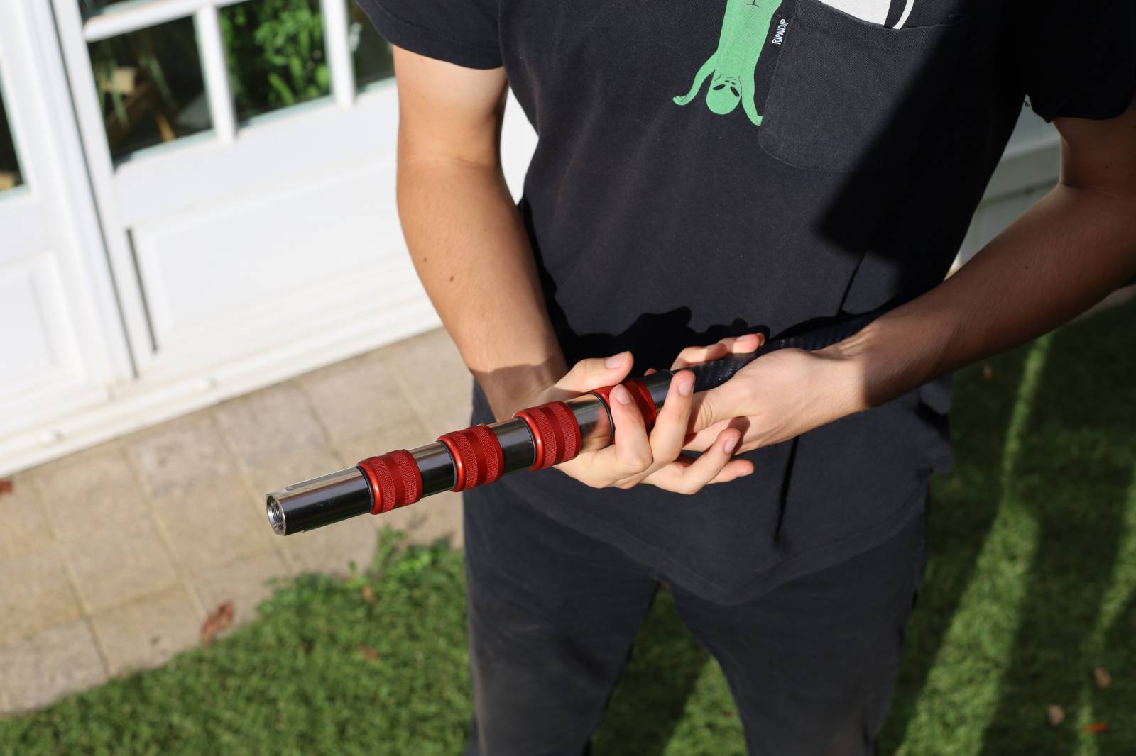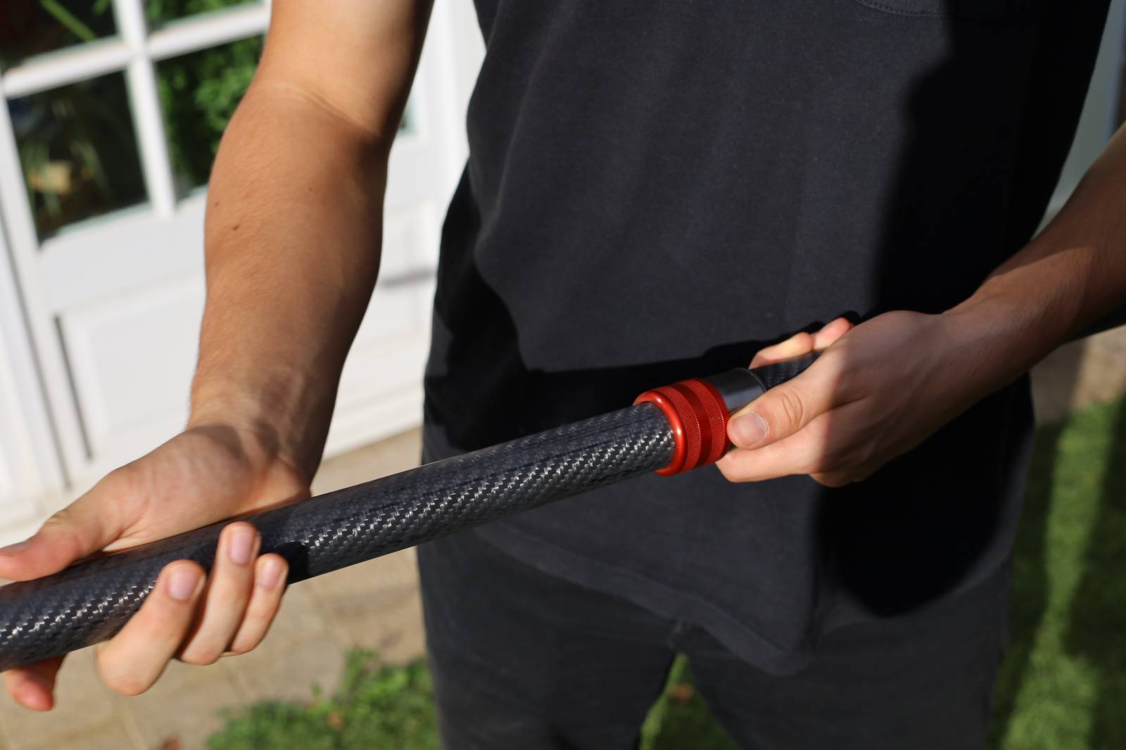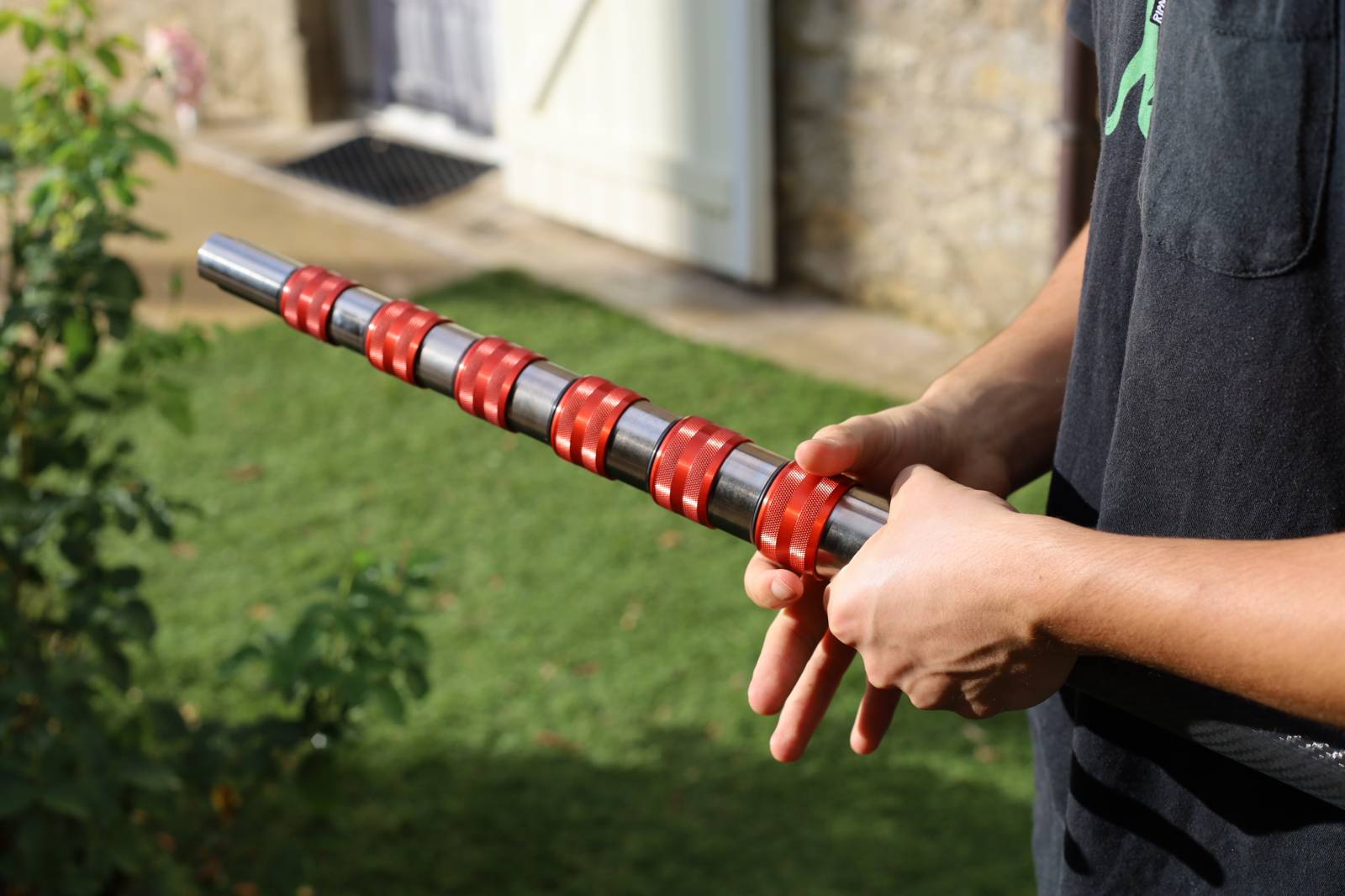 Une perche télescopique en carbone est un ensemble de tubes de différents diamètres glissants les uns dans les autres et maintenus entre eux par des éléments mécaniques (bagues de serrage).