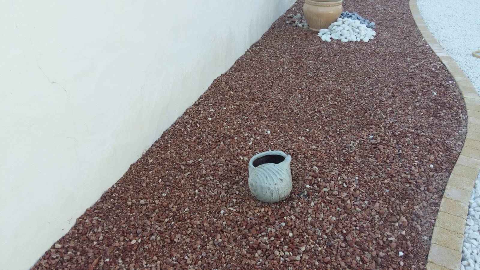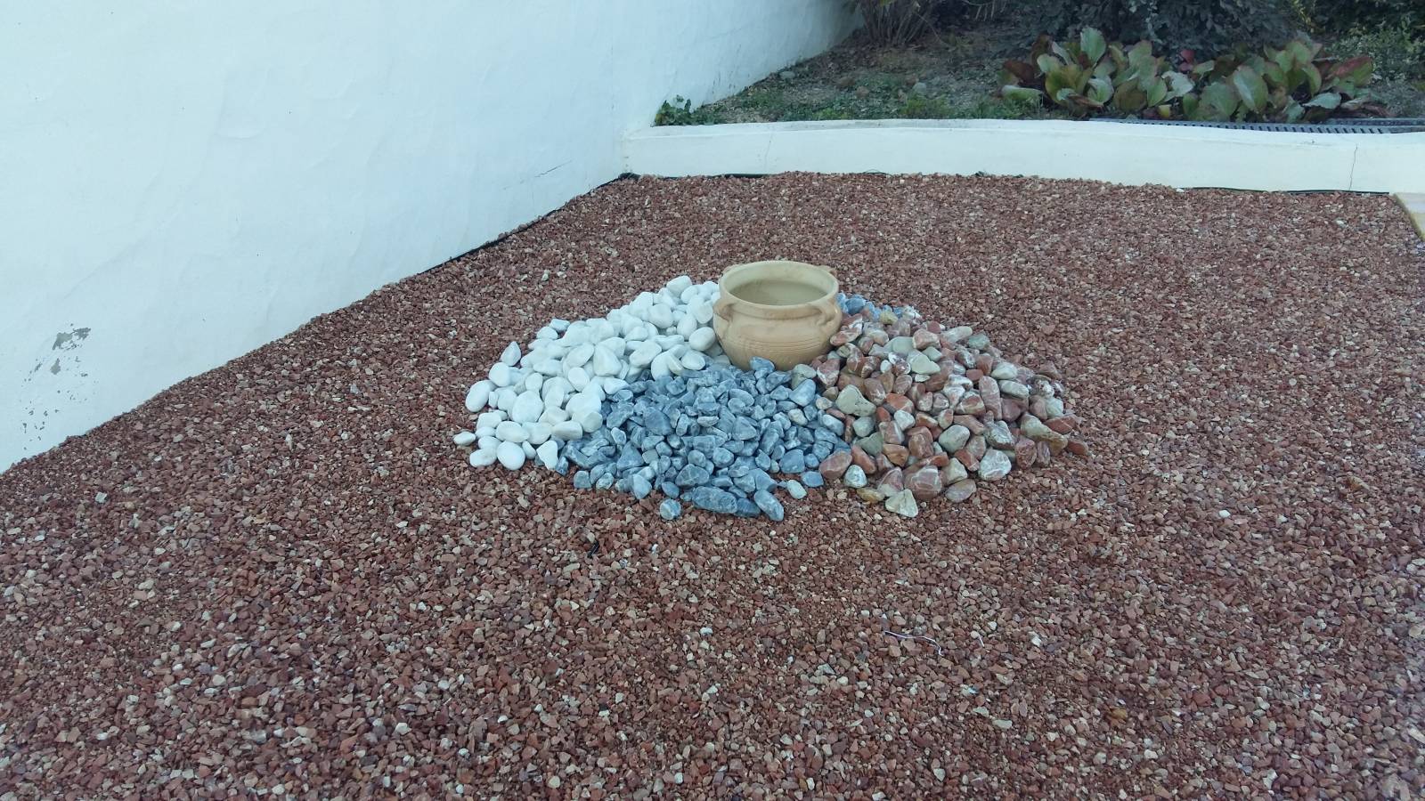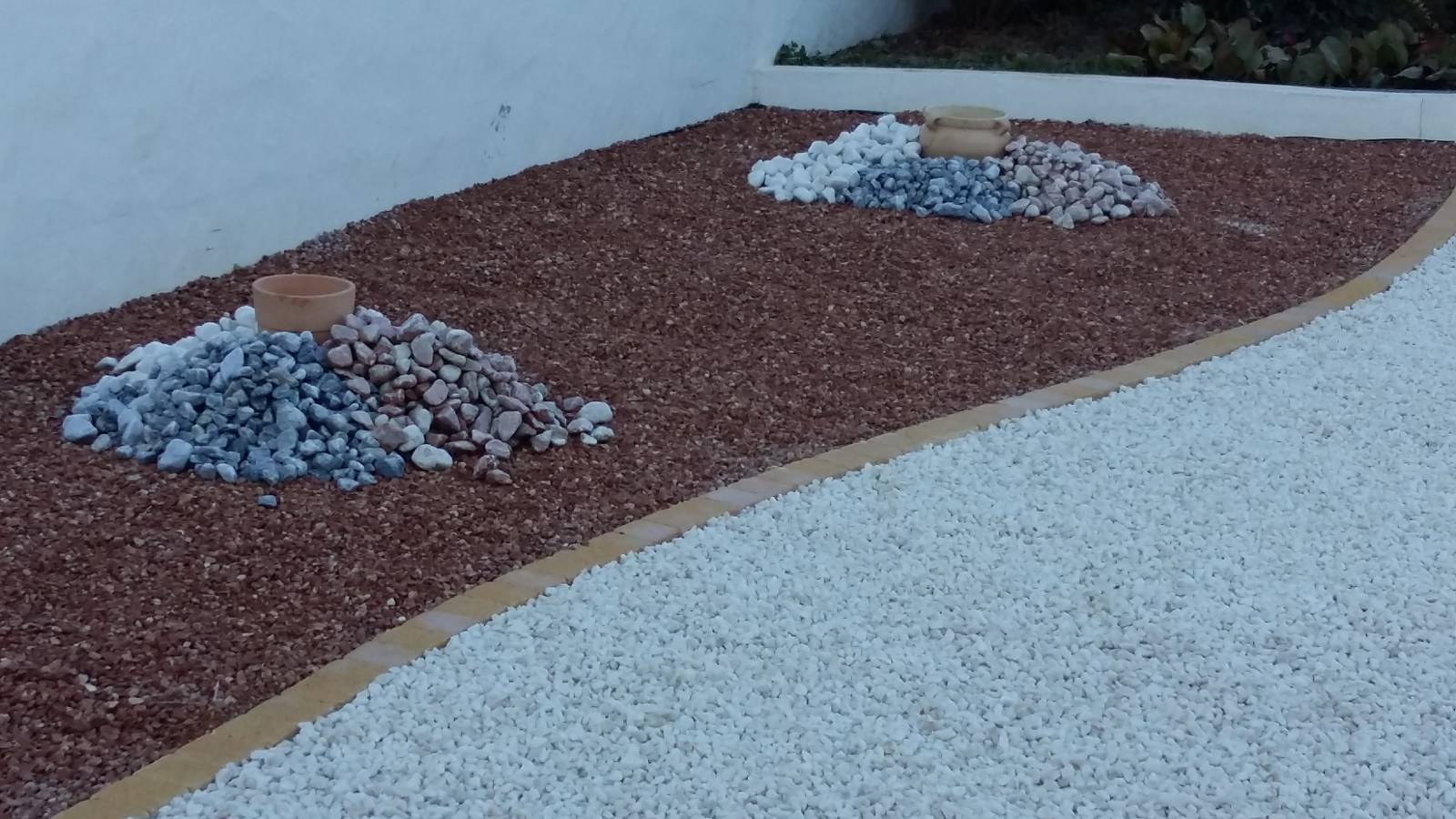Création après préparation du sol et calepinage en pavés, d'un massif en graviers décoratifs et galets.