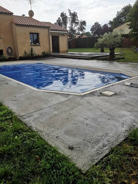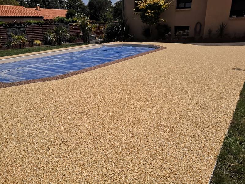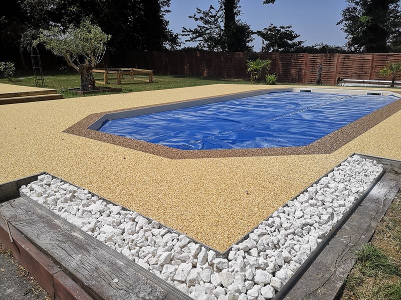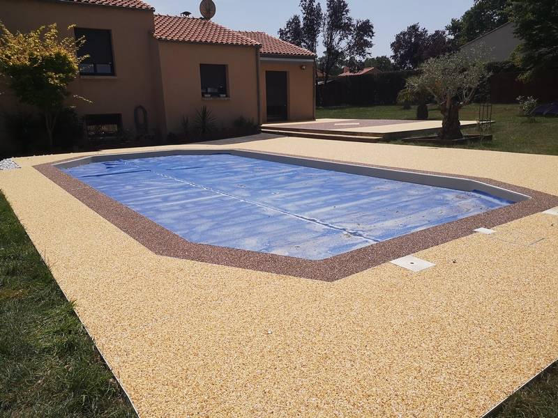 Nous avons rénové sur la région Nantaise (44) une plage de piscine avec préparation de la dalle béton existante, chape, ragréage, et ensuite revêtu de notre résine perméable "REVASTONE" avec une combinaison de couleur MIEL et EMPERADOR afin d'apporter de l'originalité et de l'esthétique.