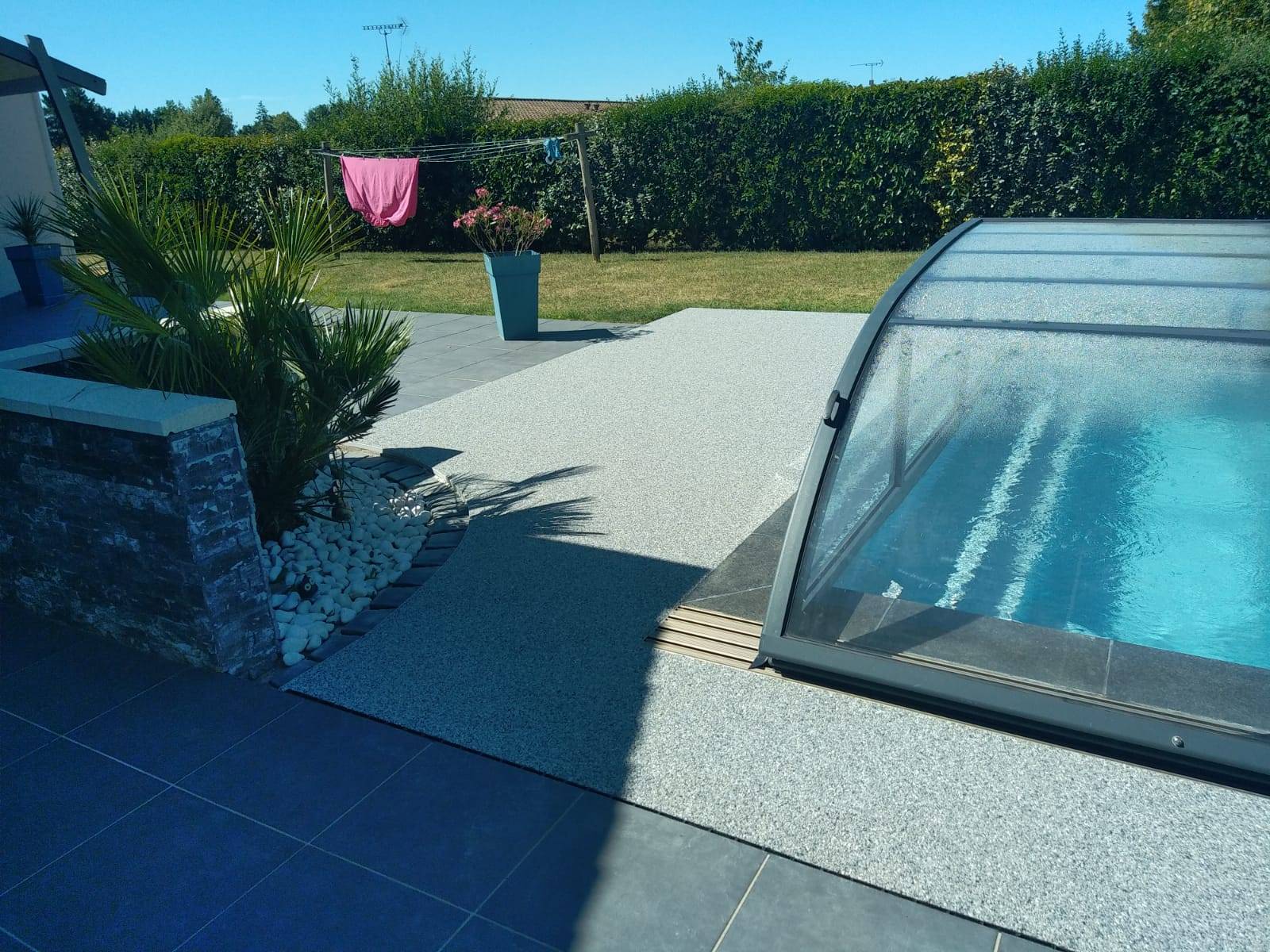 GRIS BLEU GLACIER après préparation de la dalle béton existante, chape et ragréage. Afin d'apporter une touche esthétique et originale à cette plage de piscine.