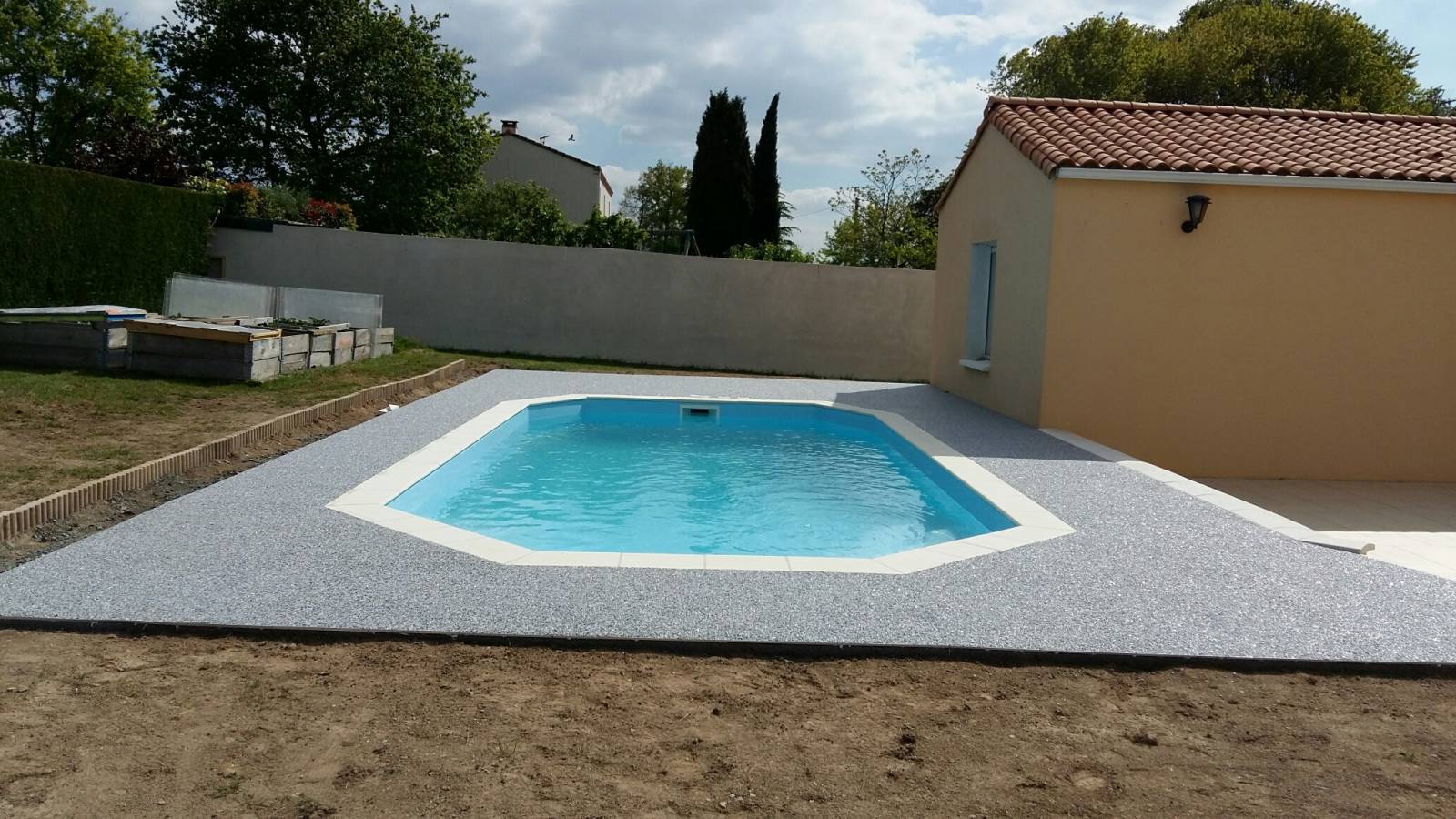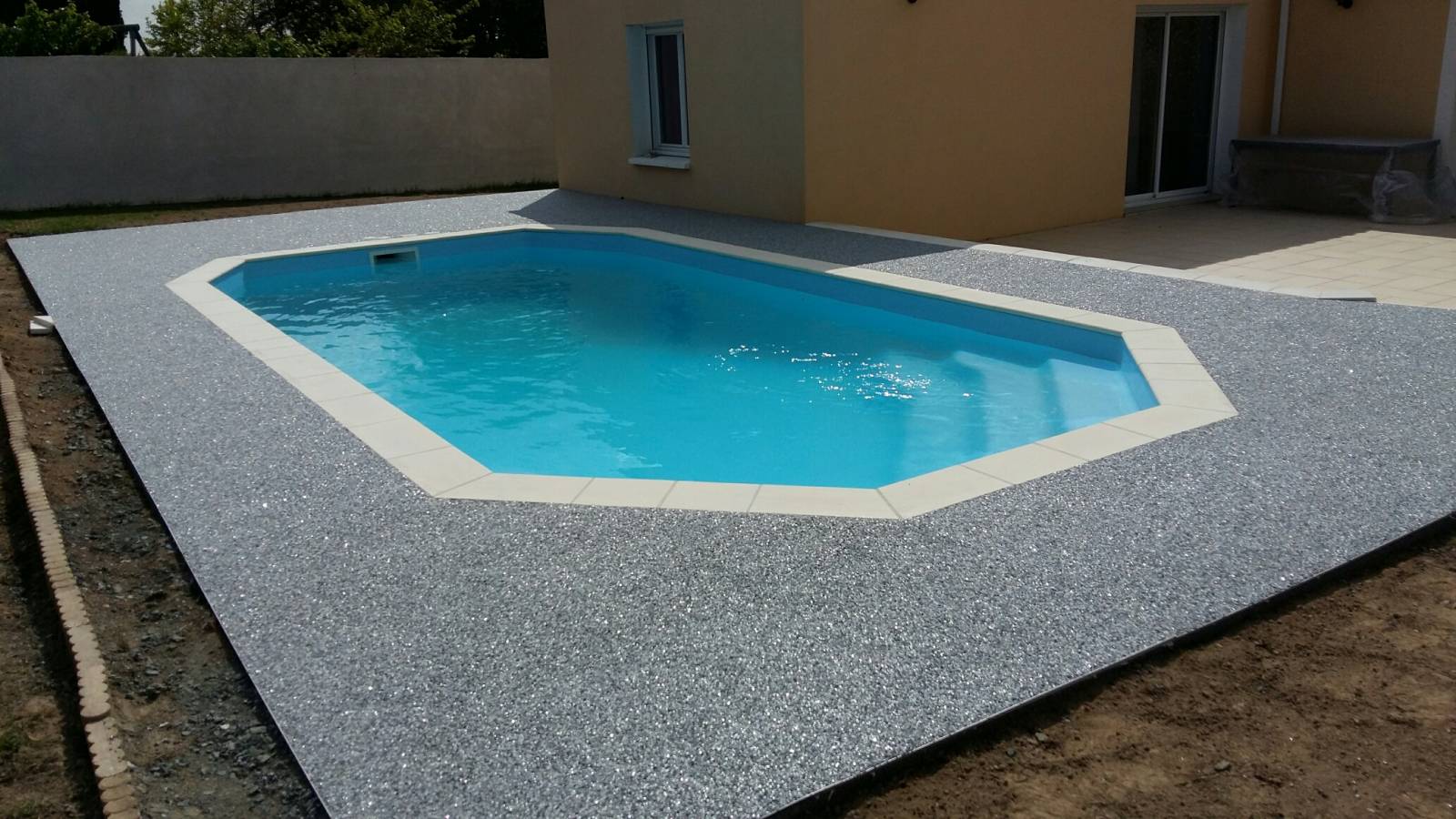 Création d'une plage de piscine complète avec la pose de margelles plates, la sous couche en béton drainant
