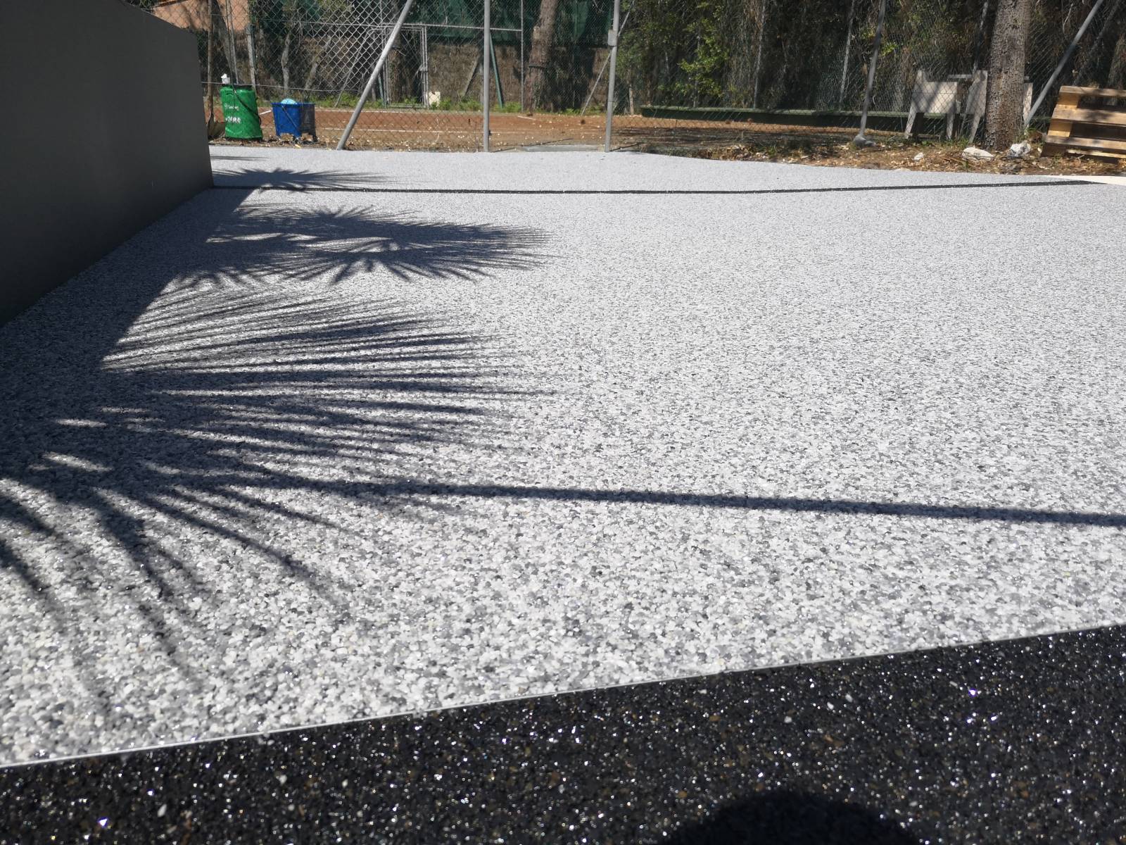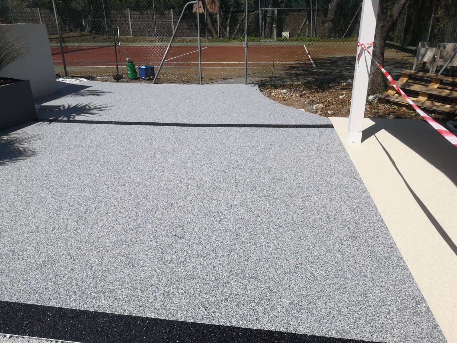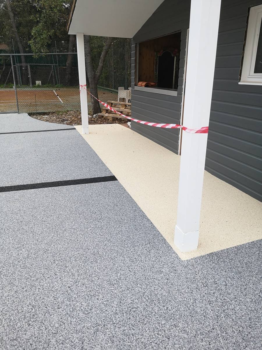 Réalisation d'une terrasse en revêtement à base de résine perméable décorative et non glissant.